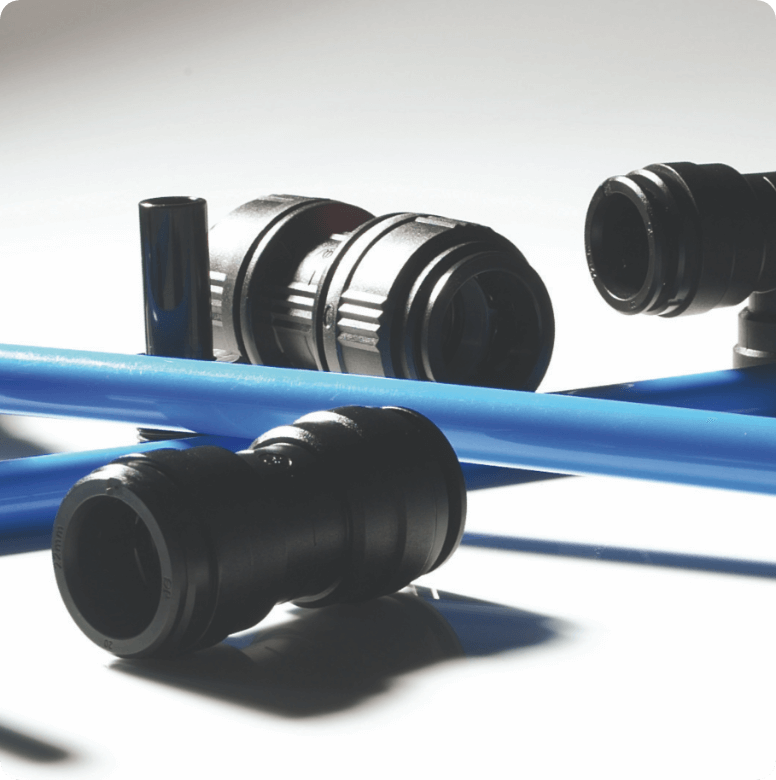 Dwa systemy złączy – z tworzywa, z mosiądzu. Seria złączy z tworzywa o średnicach fi 15mm do fi 28mm przeznaczona do rur z miedzi, Alu i tworzywa. W ofercie rury z poliamidu w zwojach i sztangach oraz Alu (sztangi). System modułowy, oszczędza czas i można go w dowolnym czasie modyfikować. „SharkBite Air” - nowy system złączy z mosiądzu w zakresie średnic od 15mm do 54mm! Większe średnice to znacznie większe przepływy. To także znakomite rozwiązanie dla przemysłu, gdyż teraz możemy zaoferować ponad 8 krotnie większy przepływ